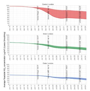 Na poniższych wykresach zaprezentowano, jak zmieniało się stężenie tlenków azotu (NO2) w Londynie na przestrzeni lat wraz z kolejnymi etapami wprowadzania Strefy Niskich Emisji.